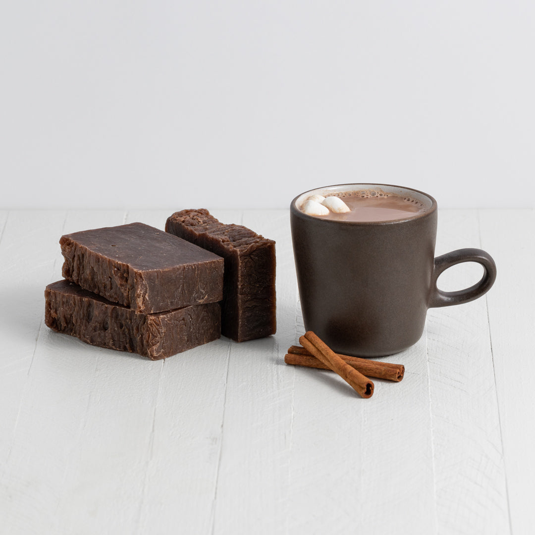 Mexican Hot Cocoa: Coconut, Olive and Castor oils, Cocoa butter, Marshmallow hot cocoa, Lye, Cinnamon essential oil.